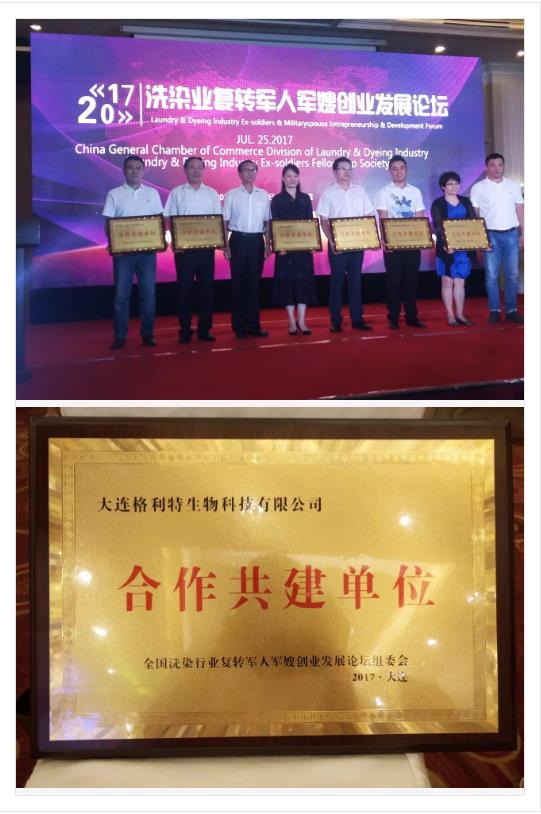 2017年7月25日洗染業(yè)復(fù)轉(zhuǎn)軍人軍嫂創(chuàng)業(yè)發(fā)展論壇曁軍人俱樂(lè)部聯(lián)誼活動(dòng)在大連圓滿(mǎn)結(jié)束。大連市洗染行業(yè)協(xié)會(huì)副會(huì)長(zhǎng)、大連市洗染行業(yè)協(xié)會(huì)公用紡織品辦公室主任、大連格利特生物科技有限公司董事長(zhǎng)延金祥先生上臺(tái)領(lǐng)取“合作共建單位”稱(chēng)號(hào)獎(jiǎng)牌。